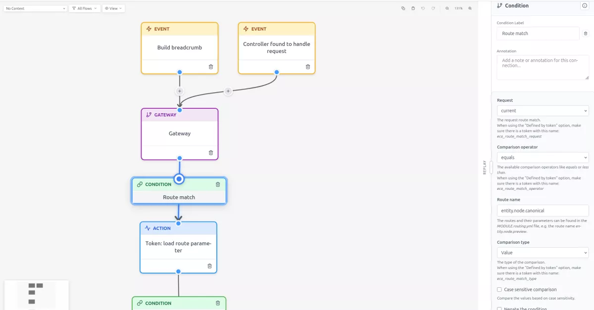 Le principe est simple : à chaque fois que Drupal construit un fil d'Ariane, le module déclenche un événement que vous pouvez intercepter via un modèle ECA. Vous définissez ensuite vos conditions et vos actions directement depuis l'interface visuelle d'ECA.